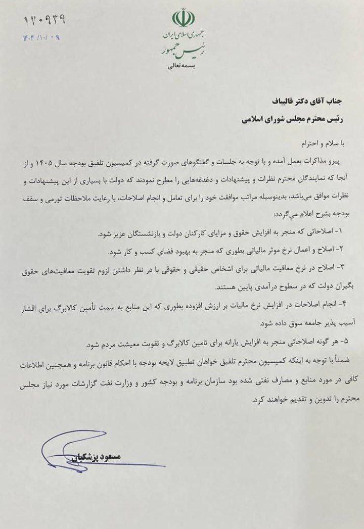 به گزارش آدینه پرس ؛ در پی رد کلیات لایحه بودجه در کمیسیون تلفیق مجلس شورای اسلامی، رئیسجمهور ضمن پذیرش ضرورت اصلاح بودجه به نفع معیشت مردم، حقوق و مزایای کارمندان، کارگران و بازنشستگان در نامهای رسمی به مجلس اعلام کرد دولت آمادگی کامل دارد اصلاحات لازم را در زمینه موضوعات مربوط به معیشت، کالابرگ، مالیات و حقوق ومزایا در لایحه بودجه ۱۴۰۵ اعمال کند.