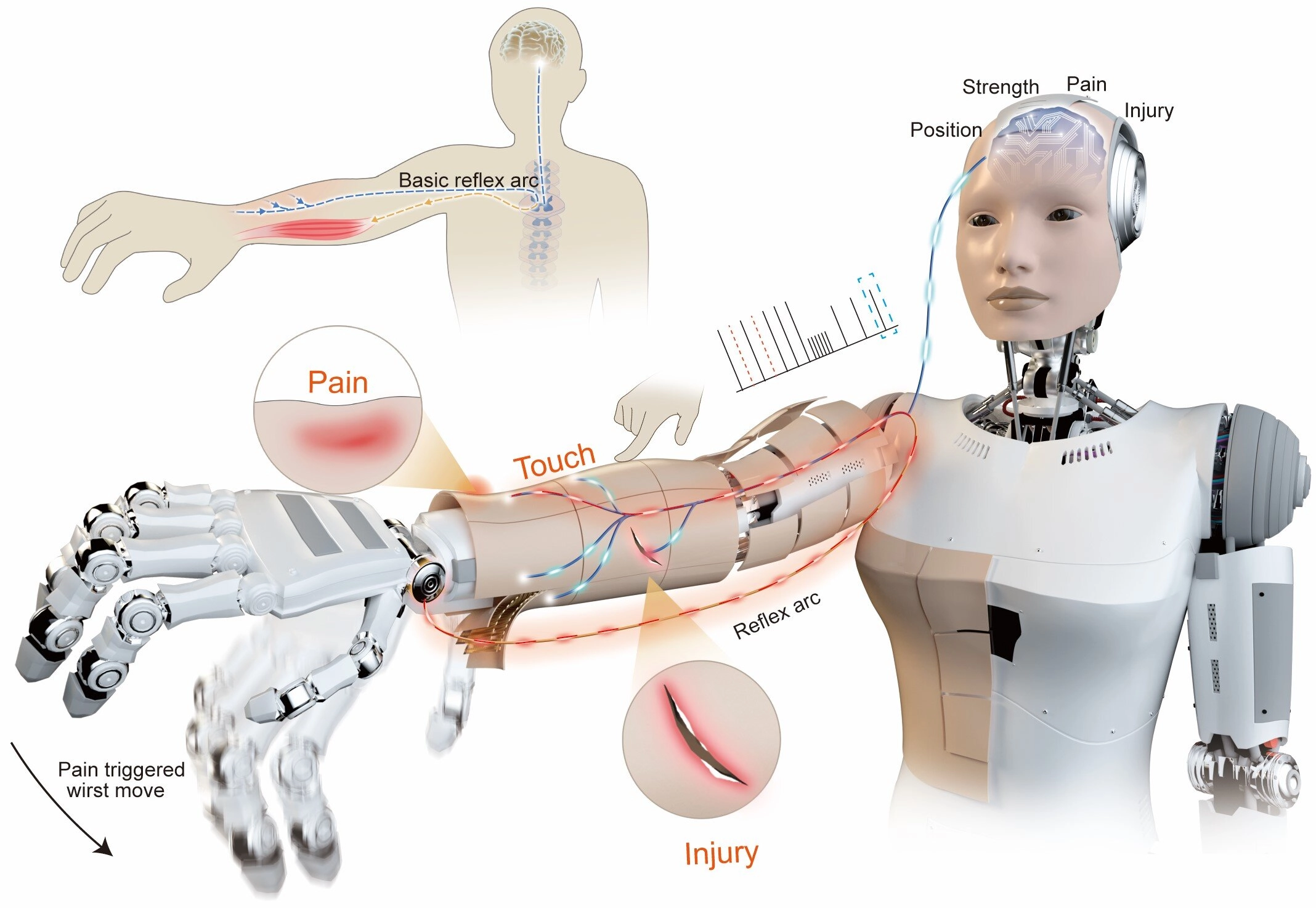 هنگامی که پوست لمس میشود، سیگنالهایی موسوم به «اسپایک» به CPU ارسال میشوند تا فشار معمولی پردازش شود. اما اگر فشار از آستانه تعیینشده فراتر رود، پوست بدون دخالت پردازنده، مستقیماً فرمان واکنش سریع را به موتورها میدهد. این همان چیزی است که در بدن انسان بهعنوان واکنش رفلکسی شناخته میشود.