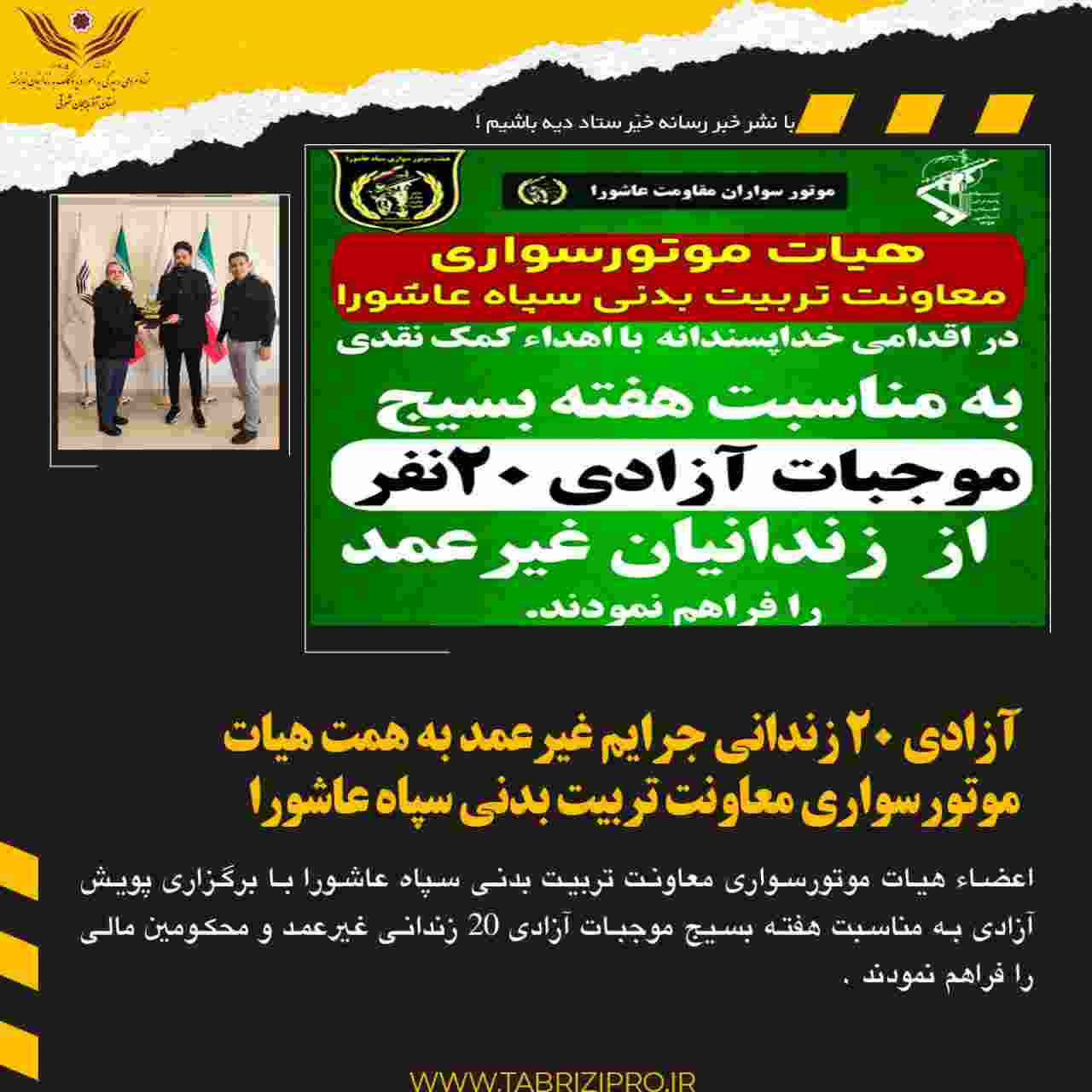 خیرین موتور سوار تربیت بدنی سپاه عاشورا با پرداخت بدهی زندانیان نیازمند ، باعث آزادی ۲۰ زندانی غیرعمد شدند.